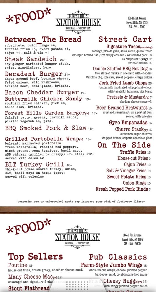 Discover Forest Hills Station House, a vibrant eatery located in Forest Hills, NY, offering a wide range of casual dining options. With a diverse menu featuring classics like Farmstyle Jumbo Wings and Steak Sandwich, as well as unique offerings like Gyro Empanadas and BaconEggNCheese, this restaurant caters to a variety of tastes. The ambiance is welcoming, with options for outdoor seating and a full bar for those looking to unwind. Customers rave about the flavorful dishes and friendly service, making it a go-to spot for brunch, lunch, dinner, and late-night bites. Whether you're looking for a relaxed meal with friends or a place to catch a game, Forest Hills Station House has something for everyone.